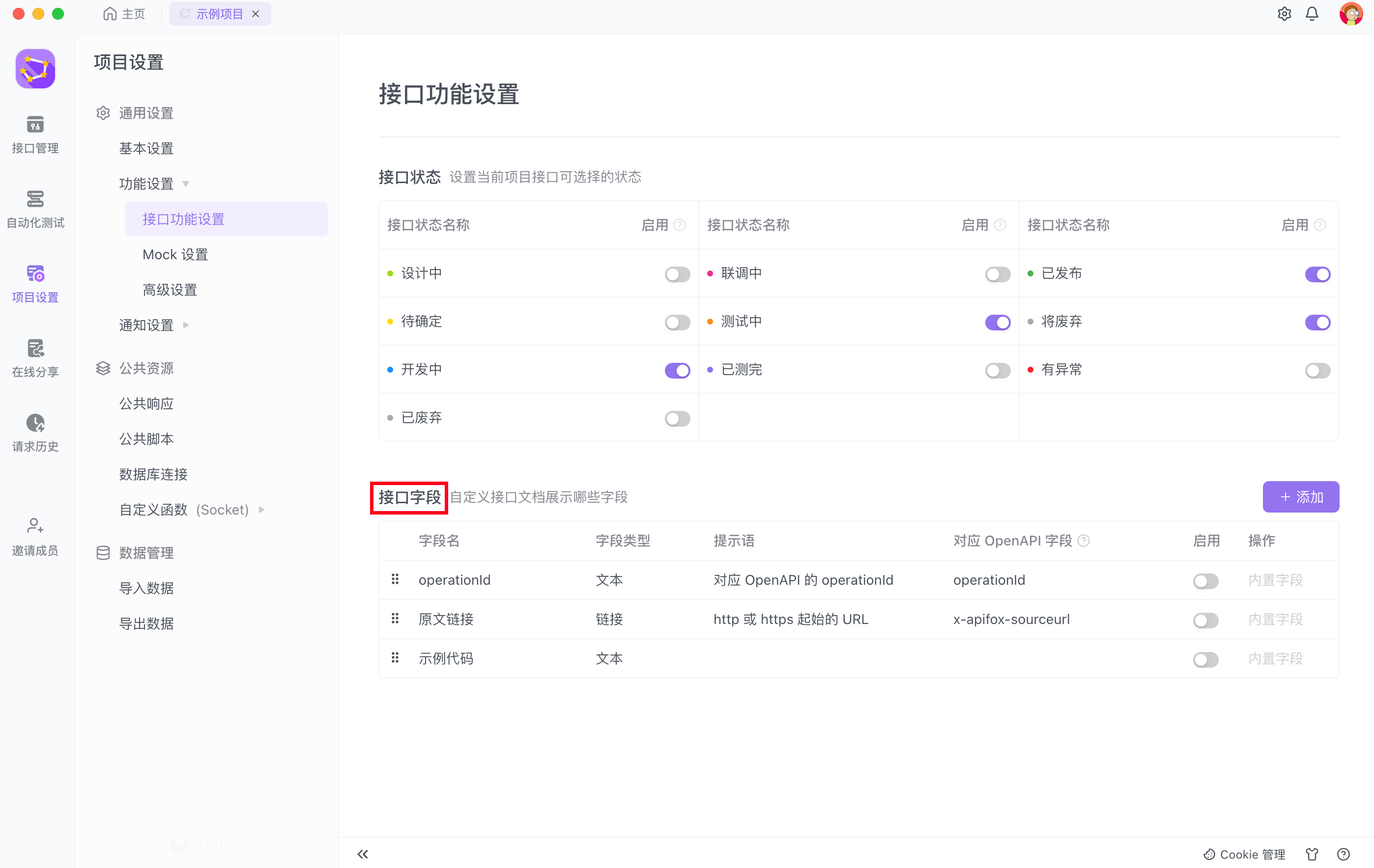 ”自定义字段“功能允许用户根据自己的需要,在接口文档中新增通用字段,比如:创建时间、TAPD 链接、需求文档链接等,以更加方便的管理项目。