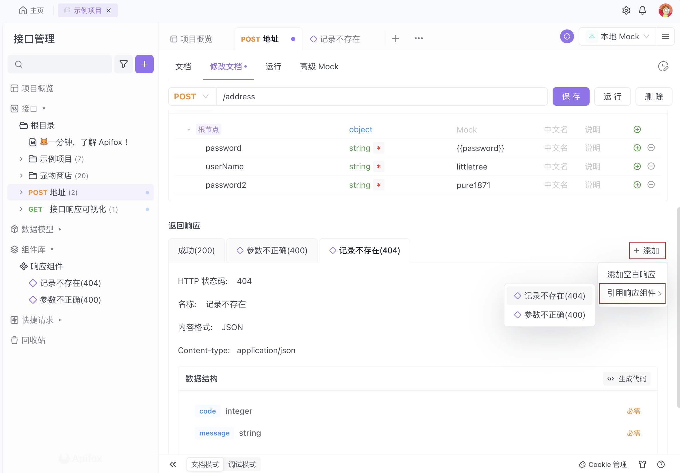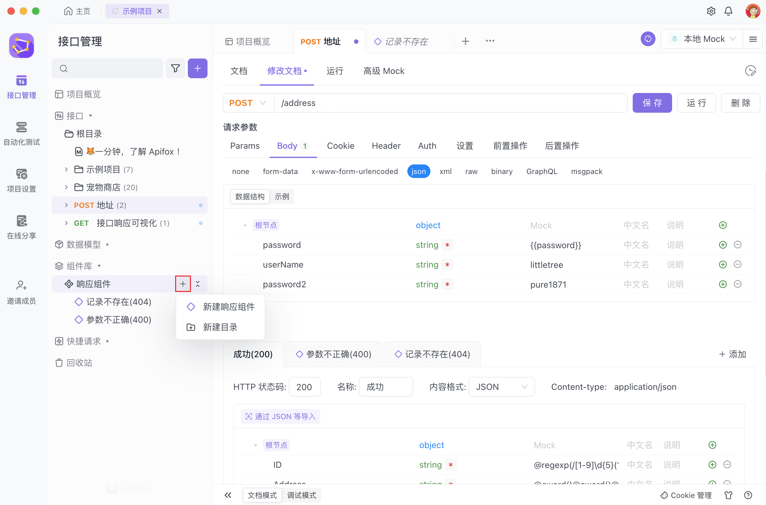 响应组件主要面向接口文档设计场景。通常情况下,一个接口的响应示例分为成功示例与失败示例两种类型。即使失败示例中的状态码可能存在差异,但返回的响应数据结构通常是一致的,因此可以将其抽离出来作为公共的响应组件并纳入统一管理,以便能够在其它接口文档中更加方便的引用。