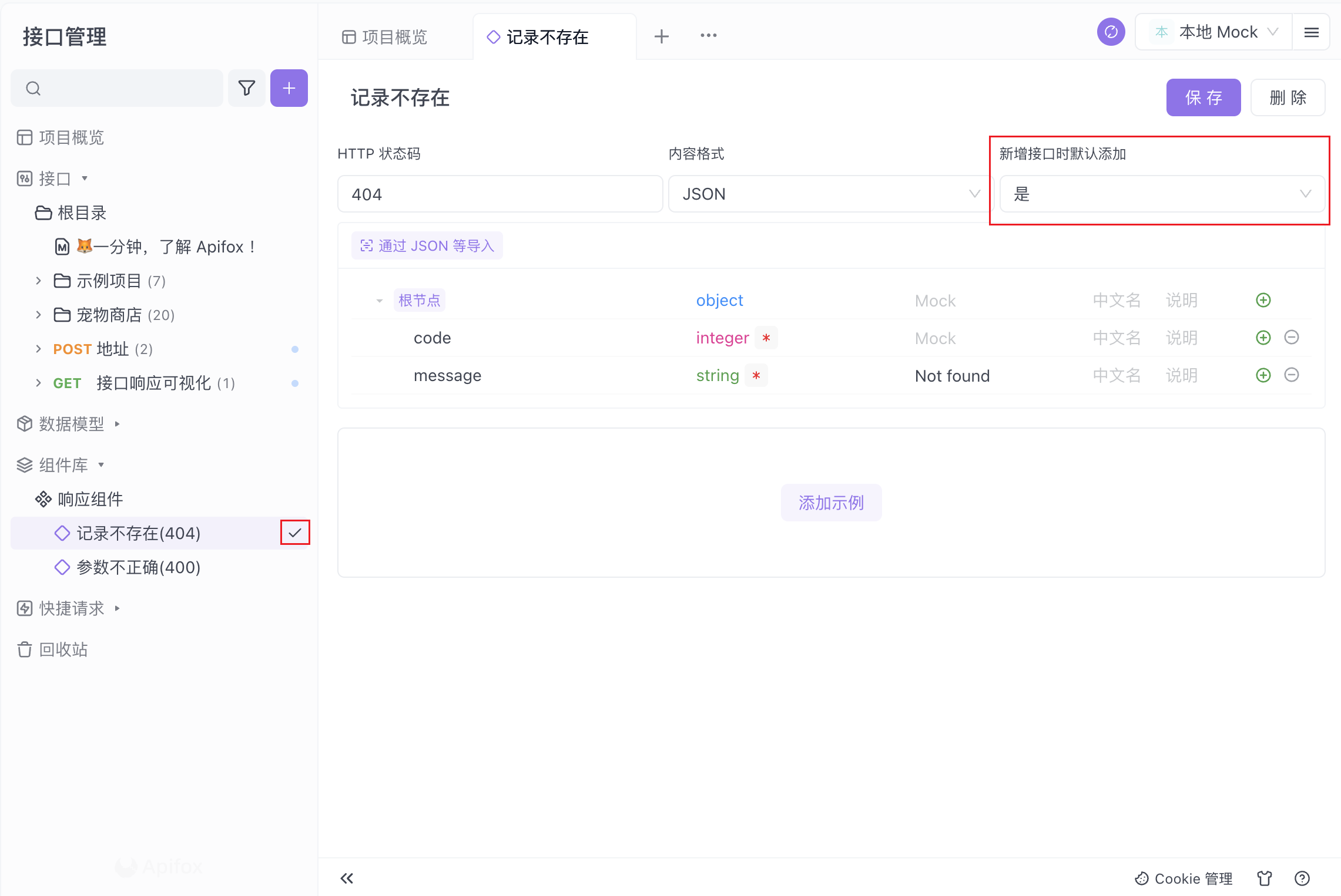 你可以将一些使用频率较高的公共响应组件(例如 404 错误)设置为默认响应组件。新建接口时将在「返回响应」中自动添加该公共响应组件,无需频繁手动添加。设为「默认添加状态」的响应组件将在目录树栏内的右侧出现打勾标记。