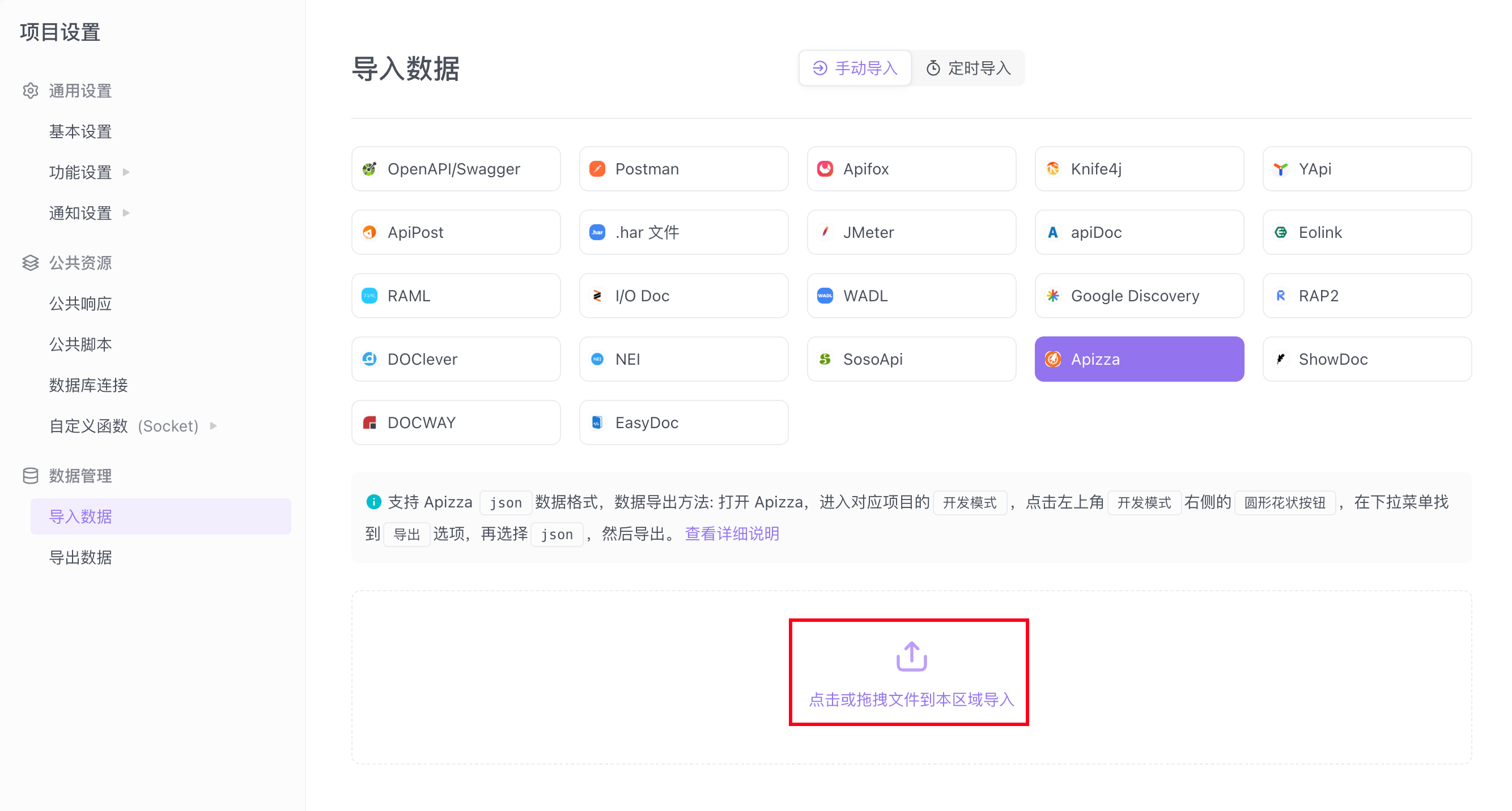 导入 / 导出接口导入接口导入 Apizza本页总览导入 Apizza支持导入 Apizza 中的 json 文件,有关于 Apizza 产品的详情说明请参考项目地址。导出数据访问 Apizza,在“开发模式”下,点击右侧的“圆形花状”按钮,轻点菜单下拉栏的“导出”选项。选择导出为 json 格式。导入数据打开 Apifox 中的“项目设置”面板,选择 Apizza,上传已导出的 json 文件。