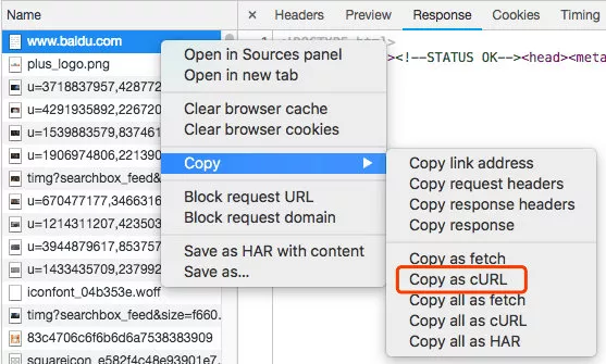 打开 Chrome 开发者工具进行抓包,找到对应接口请求,单击右键-> Copy -> Copy as cURL,如下图所示。