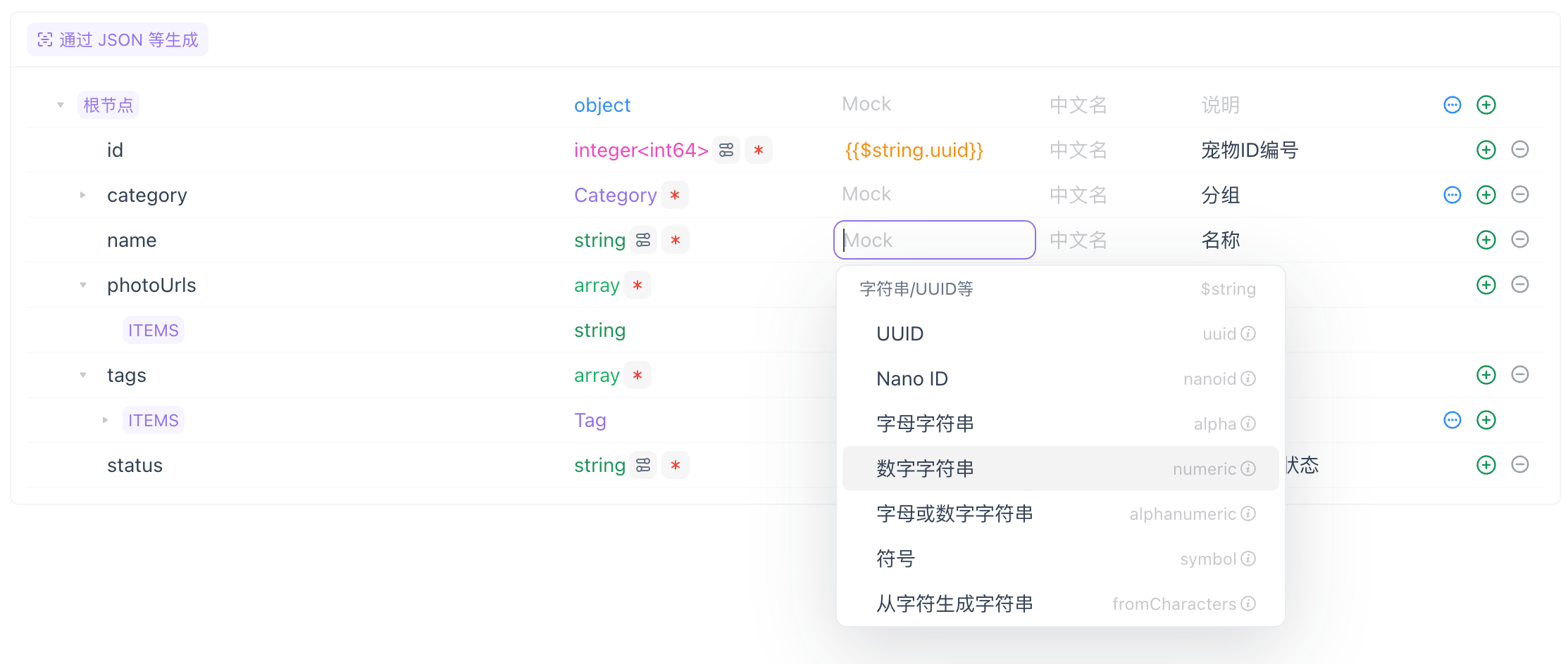 定义数据结构的时候,可手动设置 Mock 规则,支持 Faker.js 和 Mock.js “数据占位符”的方式书写 Mock 规则。