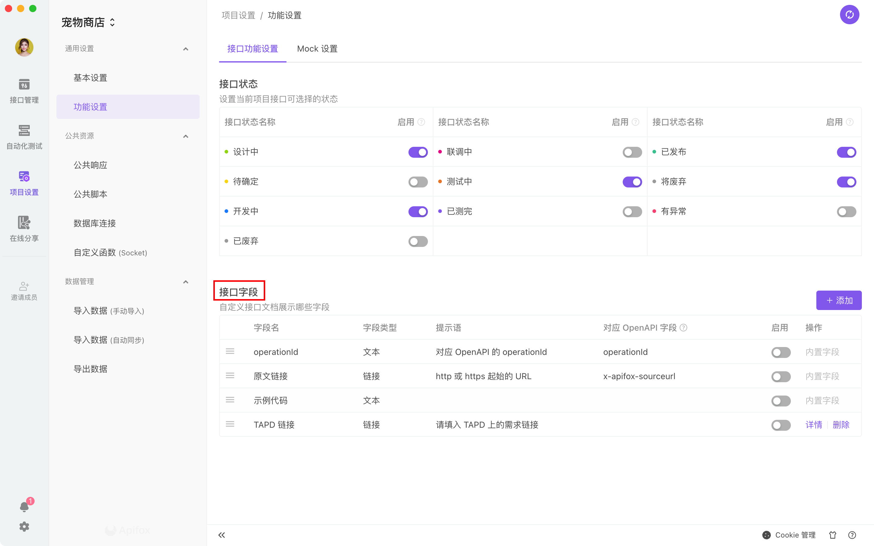 自定义字段功能,可以支持到项目管理者,可以根据自己的需要,设置接口文档的通用字段,比如:创建时间、TAPD 链接、需求文档链接等,更方便的管理项目