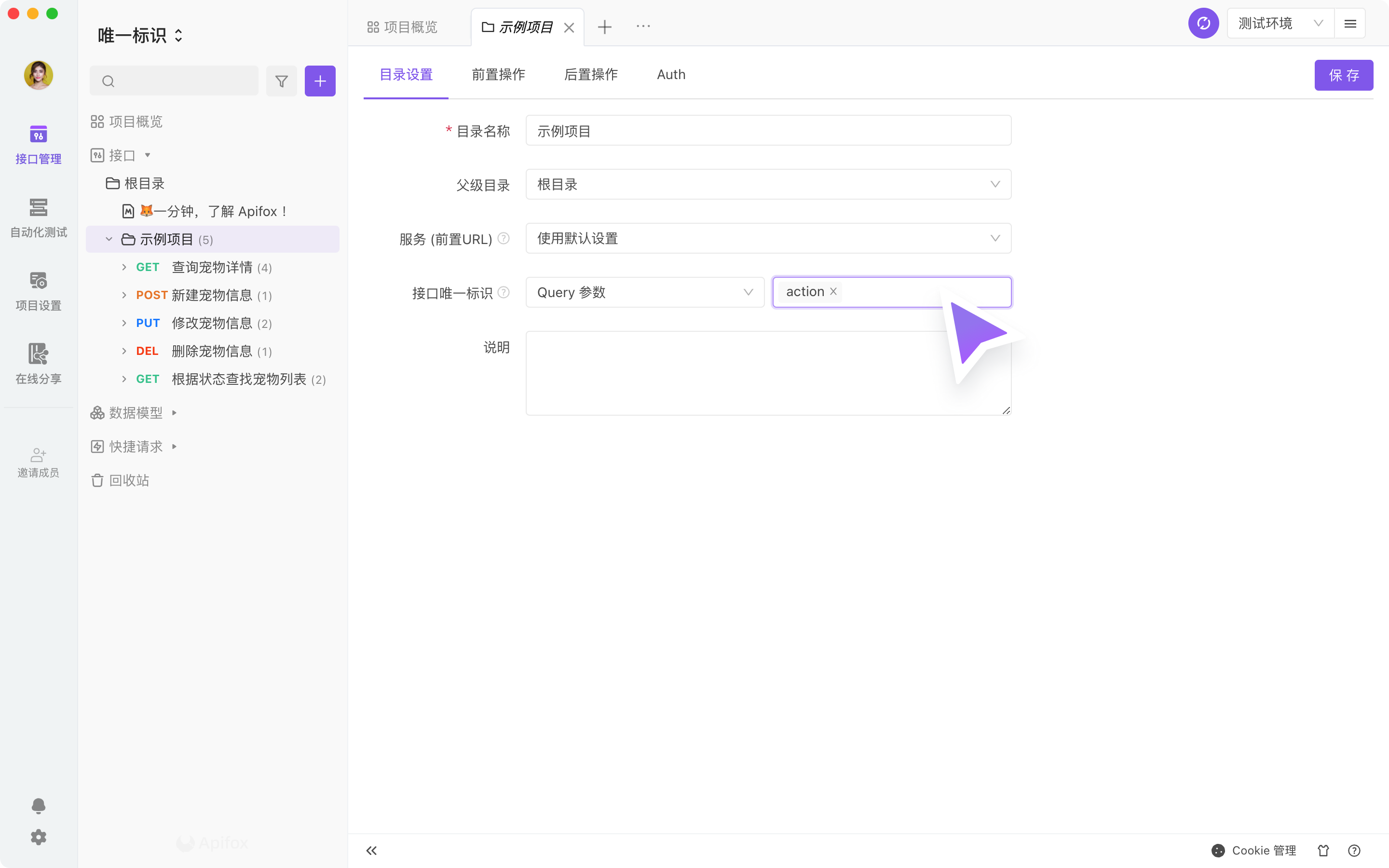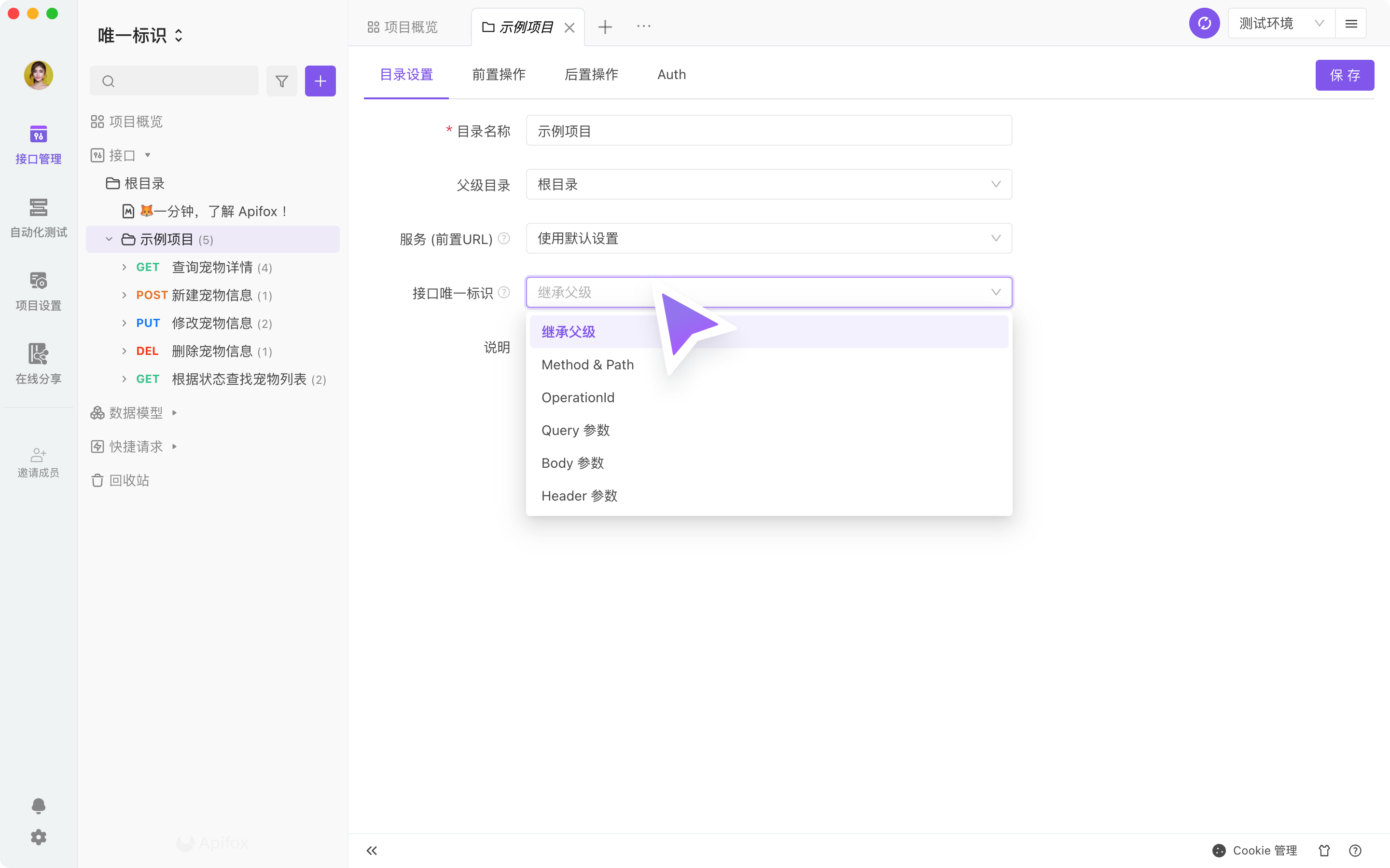 接口唯一标识,在导入 Swagger 并更新全部目录时,请避免全部项目导入到根目录进行更新,推荐设置为接口唯一标识的接口单独导入到该特殊子目录中。
