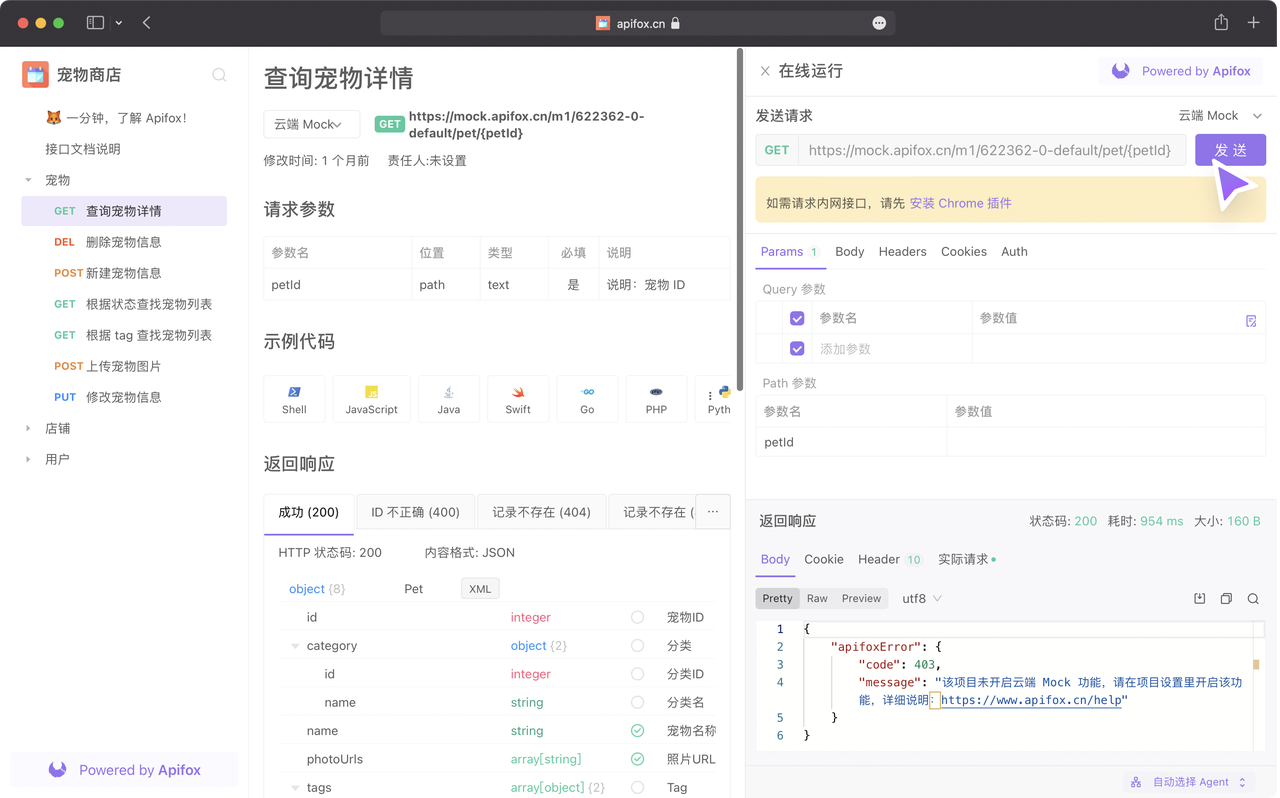 分享出去的 在线接口文档 支持显示示例代码,当然 API Hub 也是支持的。您可以直接复制当前接口的代码,直接使用。