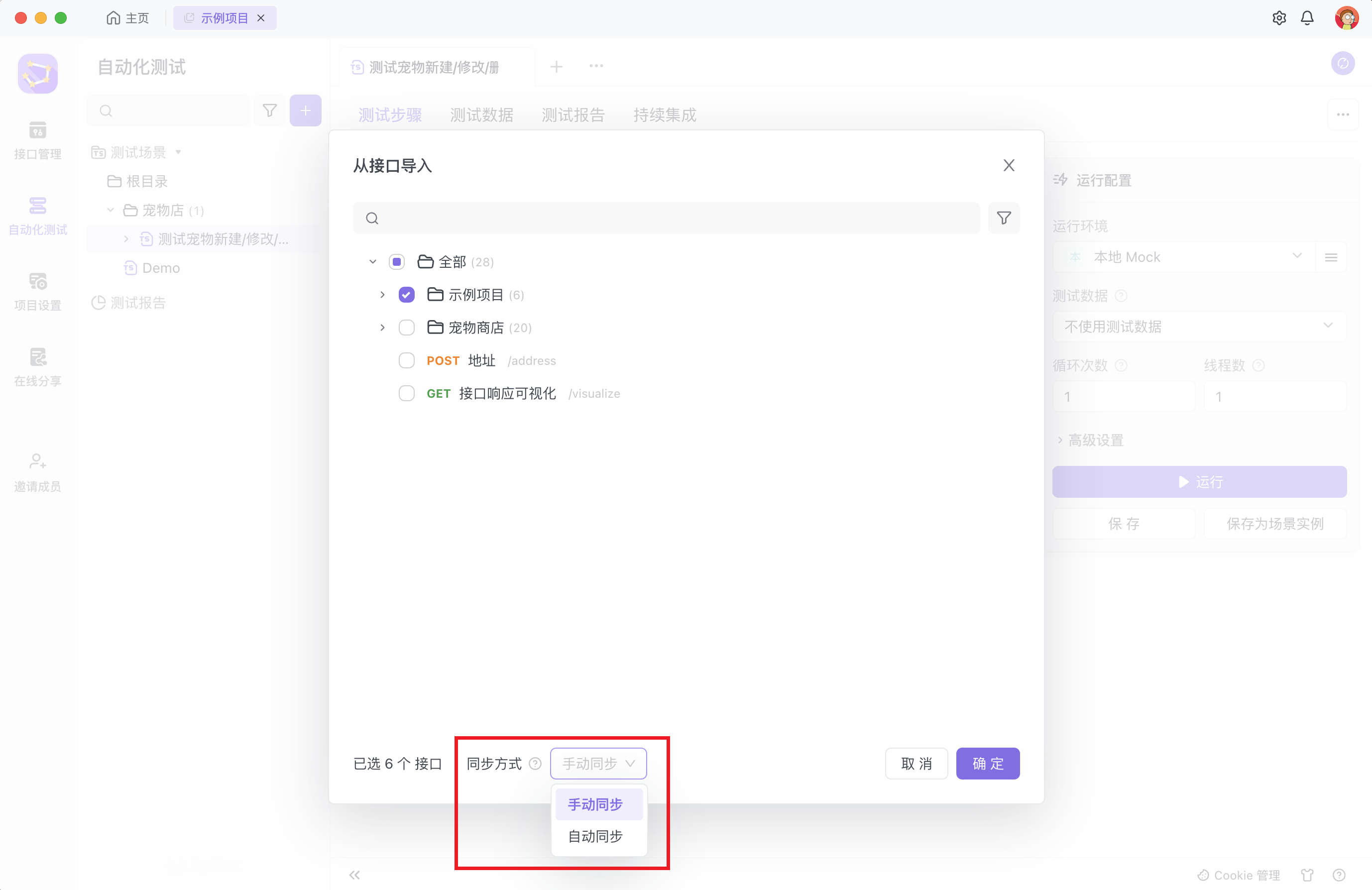 在测试步骤中导入接口文档/用例时可以选择手动同步或自动同步模式。