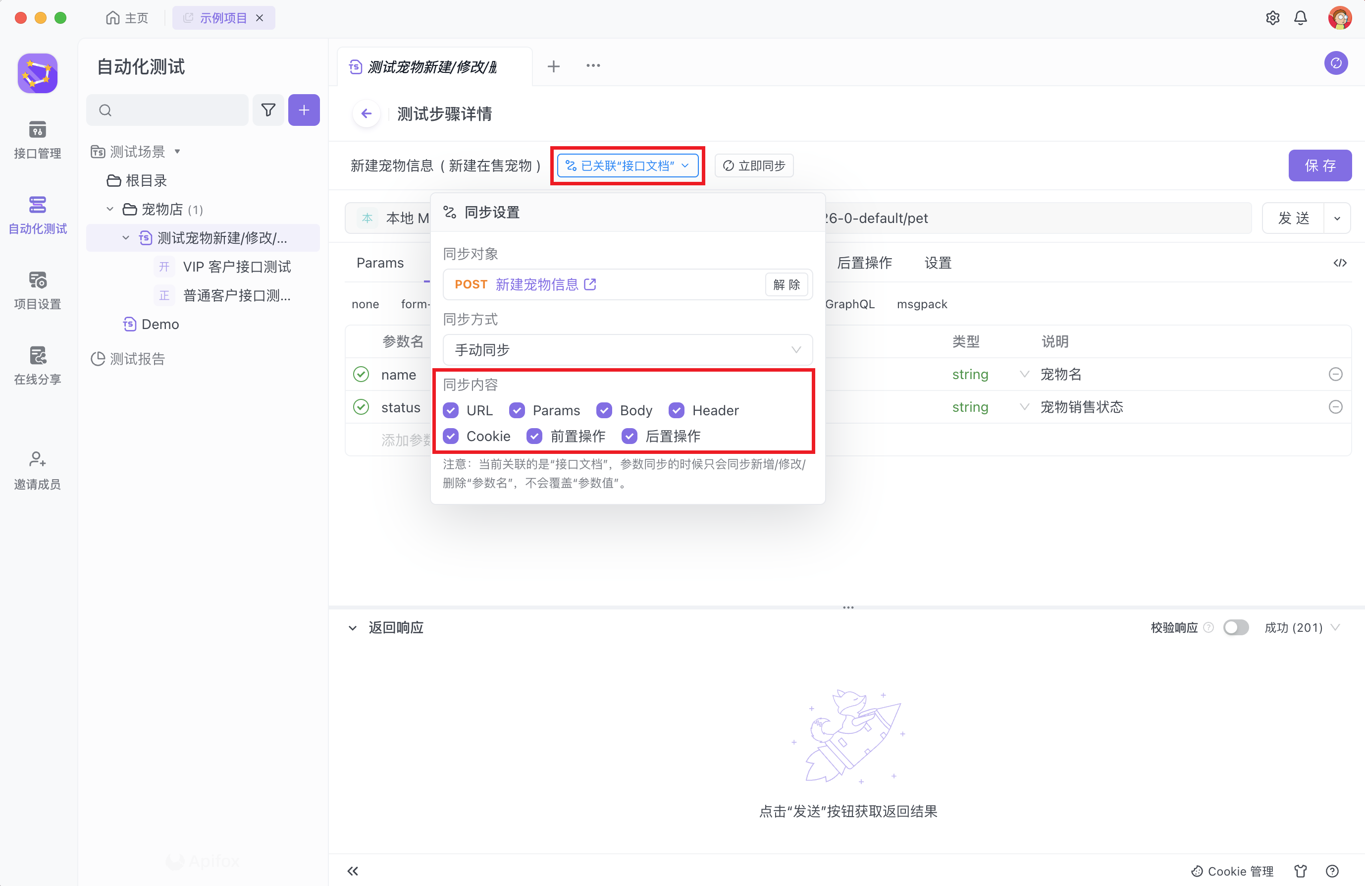 触发手动同步后,测试步骤将同步接口文档中的数据,包括“参数名”“前后置脚本”等内容。注意同步的对象是接口文档,如果接口文档的请求参数中没有设置示例值的话,同步内容是不包含“参数值”的。