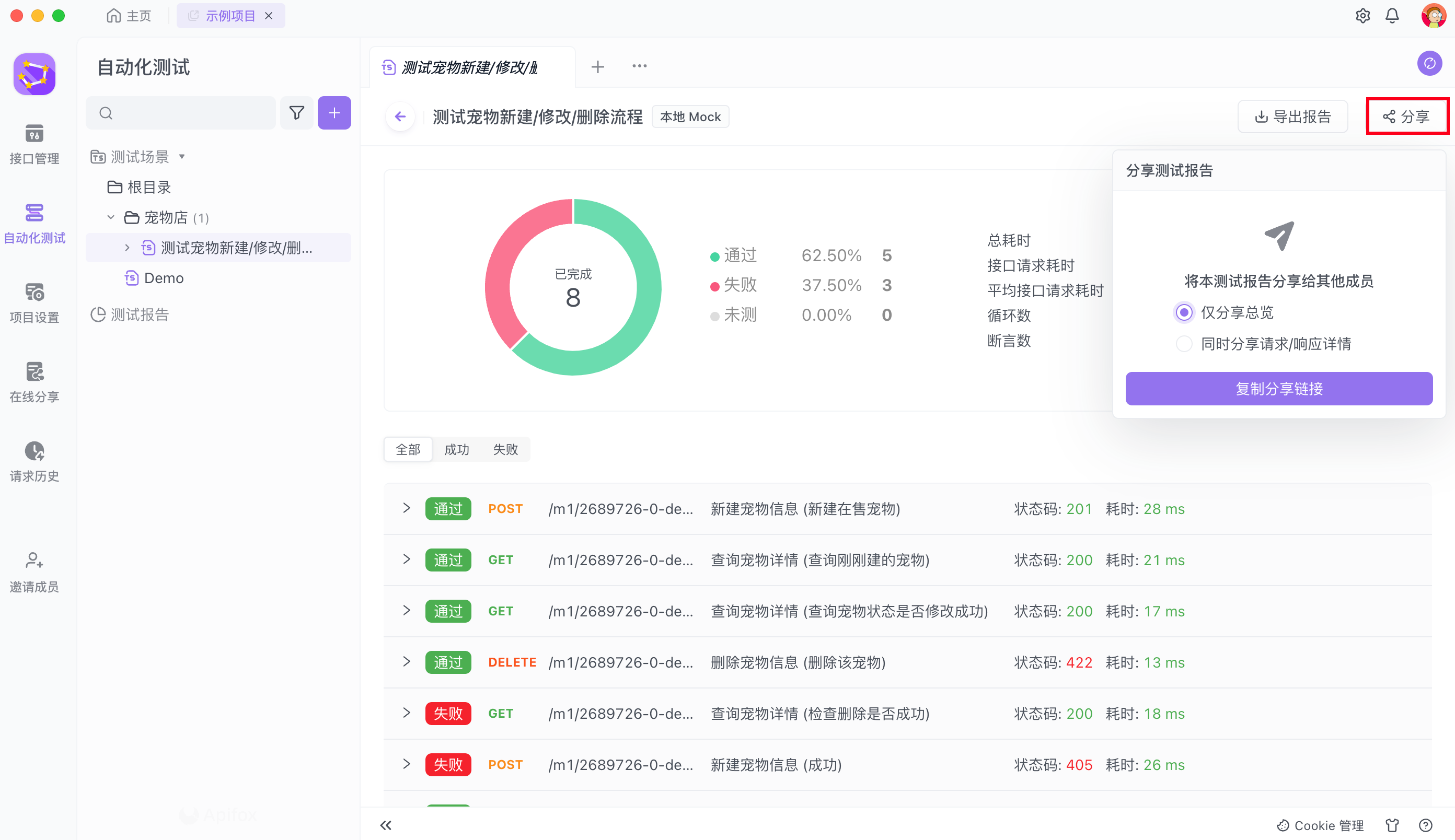 如果你可以访问此报告的请求/响应详情,那么可以勾选“同时分享请求/响应详情”选项,将这份测试报告中的所有接口请求/返回详情一并进行分享。其他用户打开链接后也可以直接看到该测试报告的详情,提升团队协作效率。