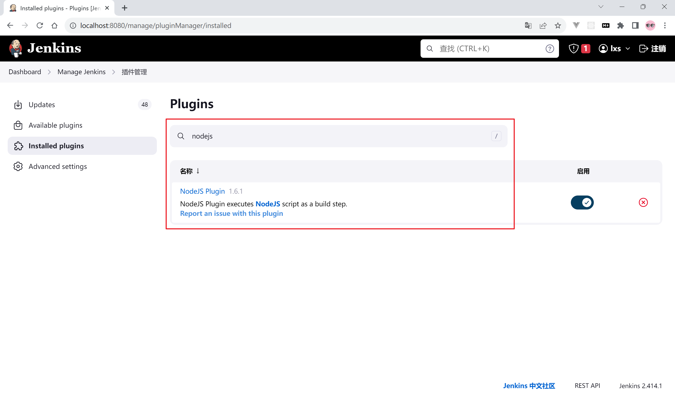 1、打开 Jenkins 插件管理,找到 NodeJS 插件,安装 NodeJS 并重启 Jenkins。