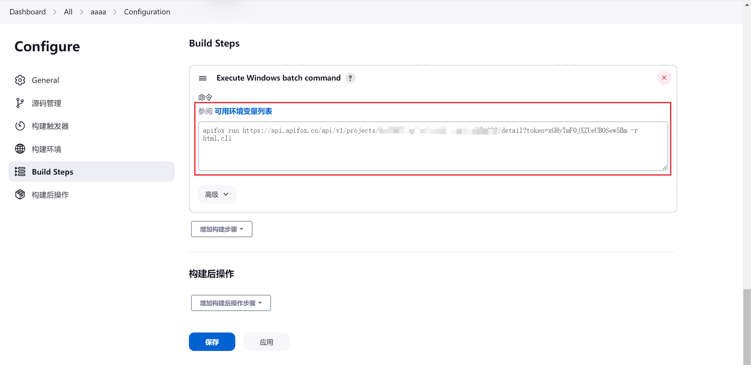 在 Windows 系统下,你可以选择 “Execute Windows batch command”,Mac 系统下,你可以选择 “Execute shell”。然后将 Apifox Cli 的命令拷贝进去,保存并运行即可。