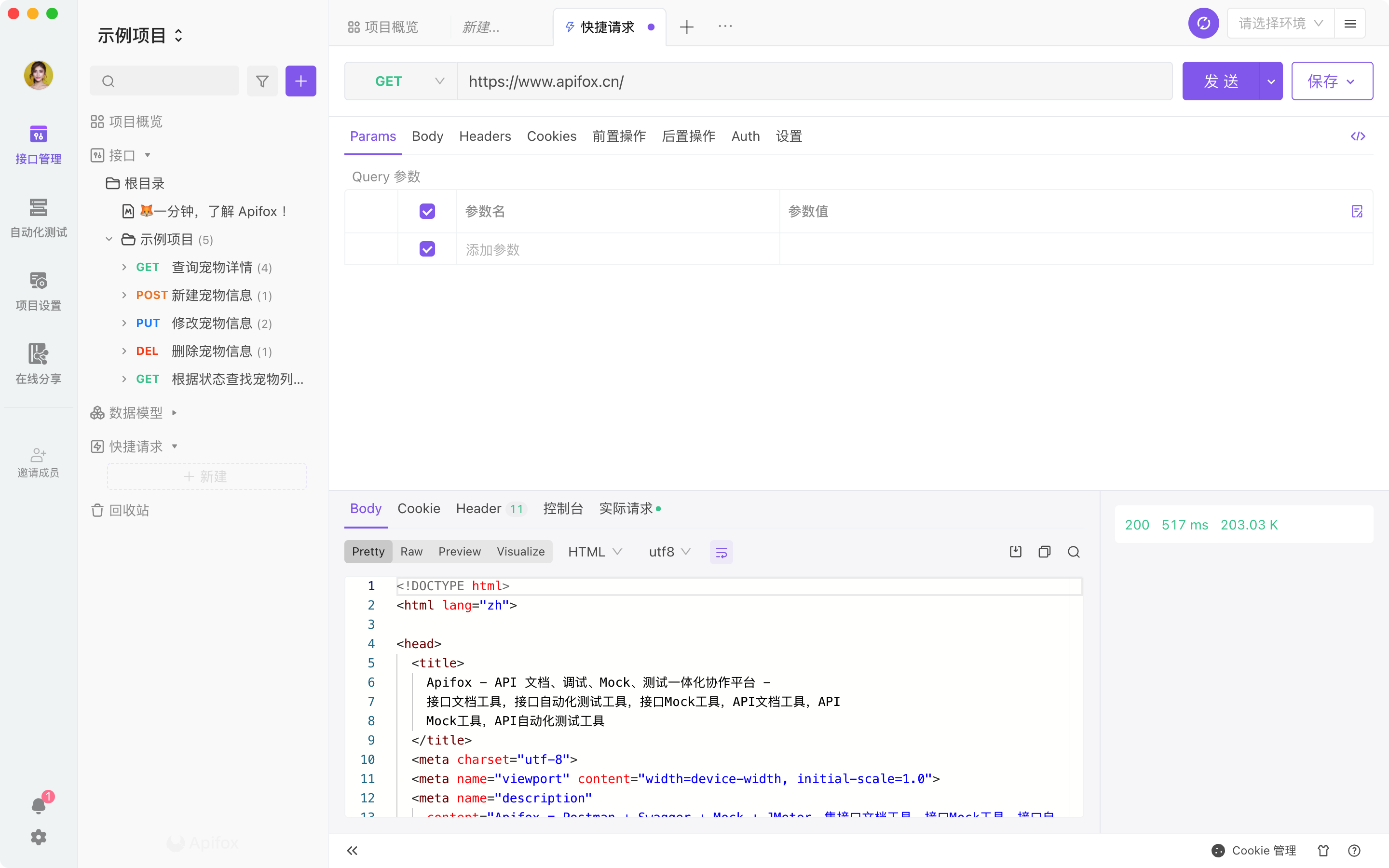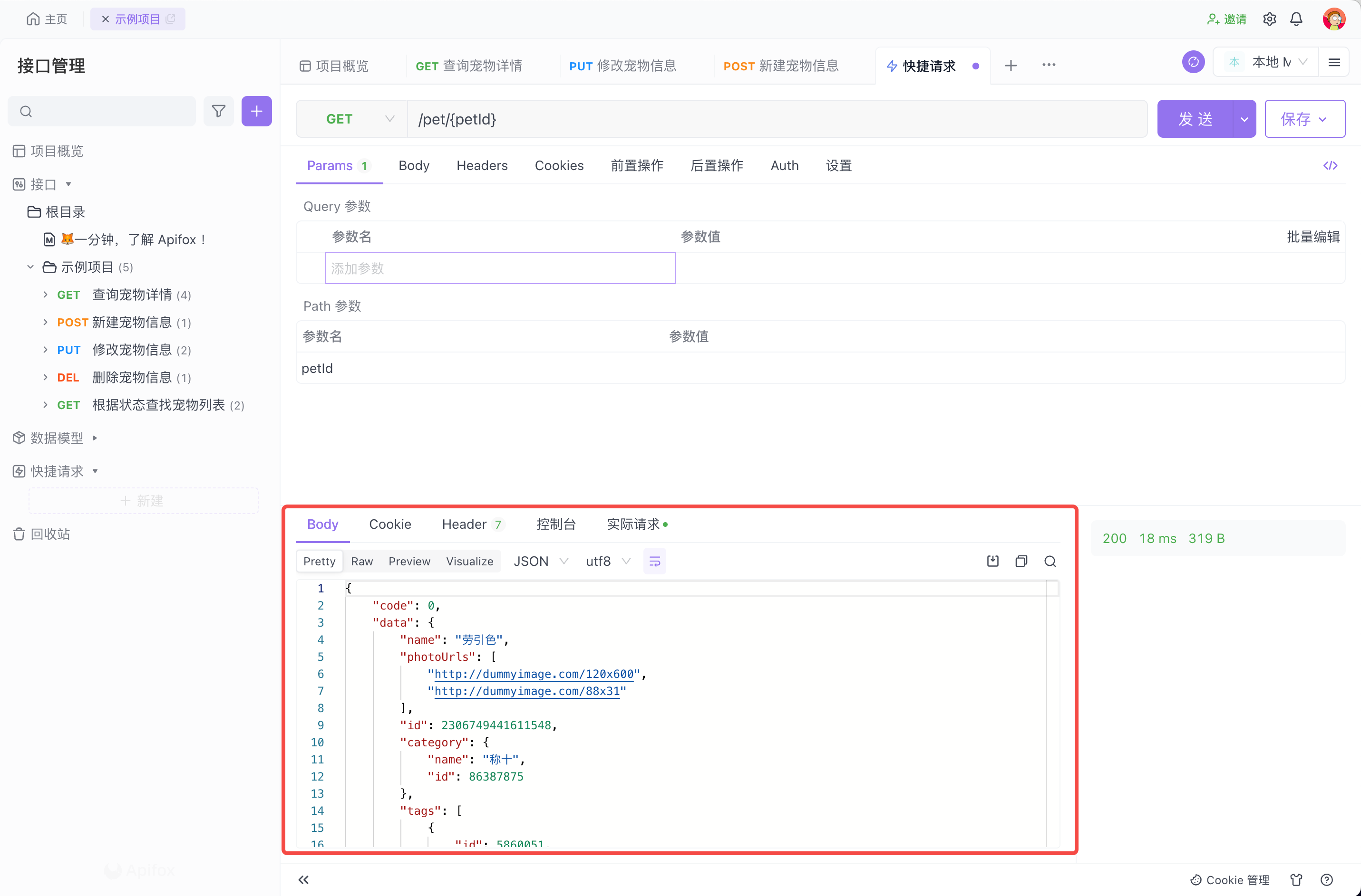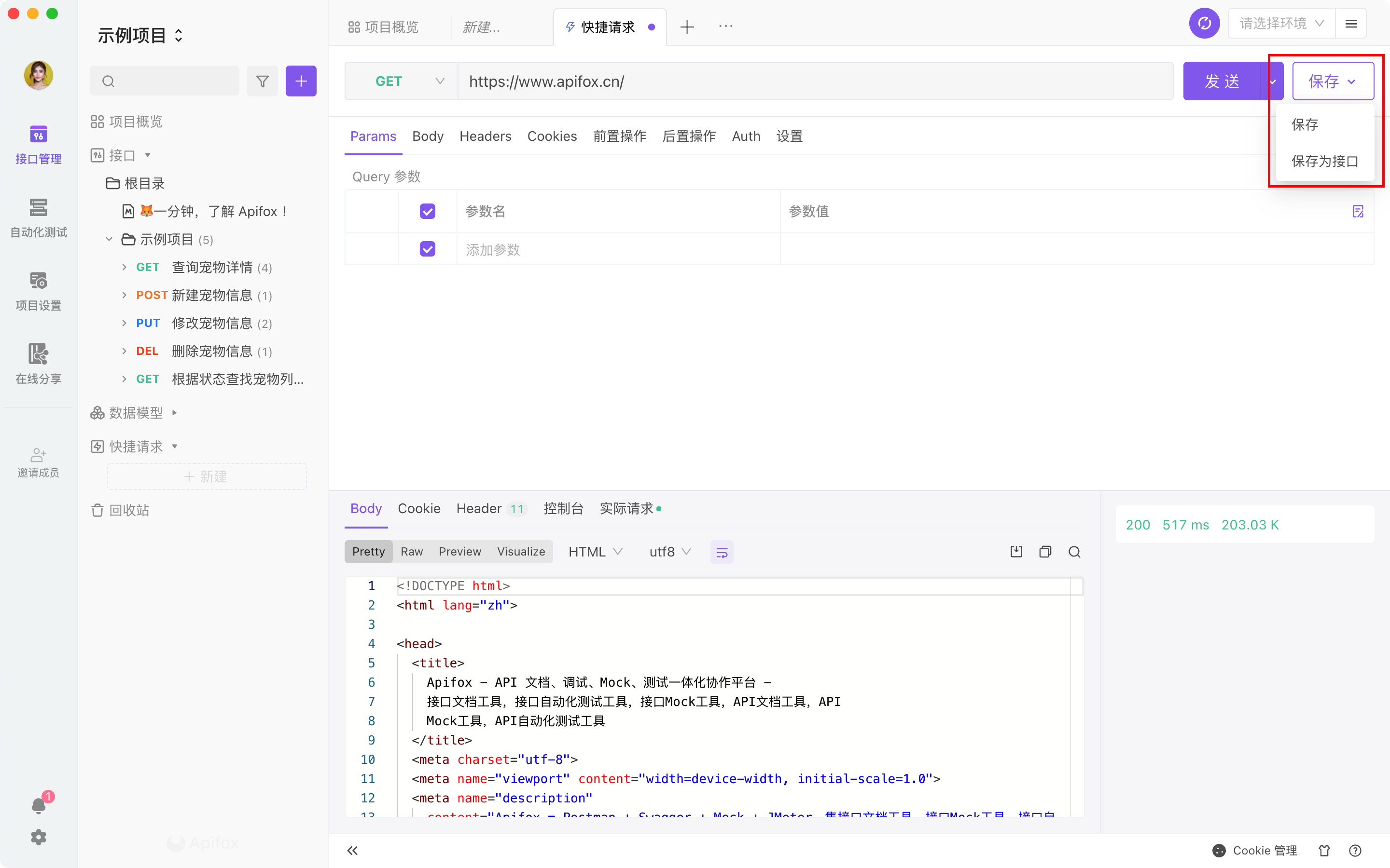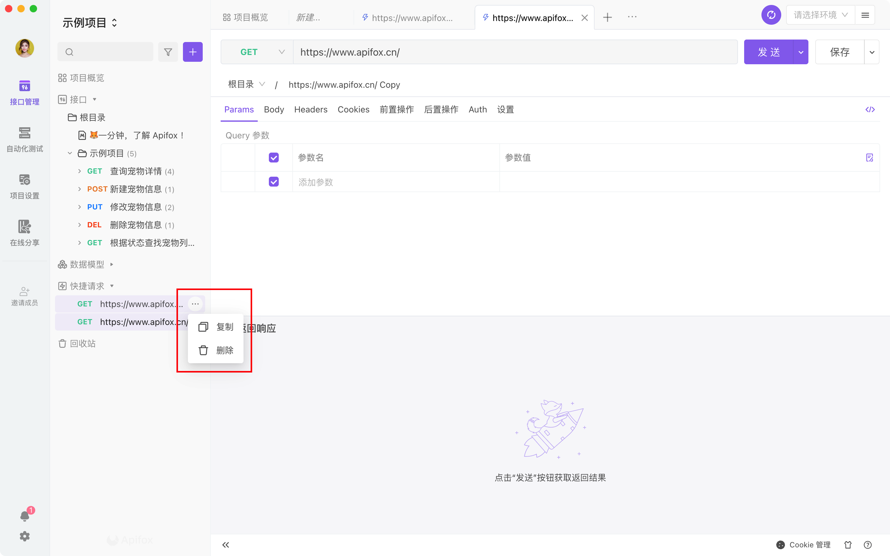 接口调试快捷请求本页总览快捷请求视频内容下文将以一个简单的 HTTP 接口为例,详细说明如何使用 Apifox 发起接口请求并接受调试响应。新建快捷请求鼠标移到左侧搜索框旁边的 + 号按钮,在下拉列表里选择快捷请求。你也可以将鼠标移动到左下侧的功能菜单,并在快捷请求右边点击 + 号按钮。输入接口 URL 及参数后轻点“发送”按钮。发送请求后查看响应结果。注意如果输入的 URL 未添加 http:// 或 https:// 作为起始参数,那么实际发出请求的时候将会自动加上当前环境中的前置 URL。保存为接口调试完成后,若此接口可以在后续复用,可以选择保存为快捷请求或接口文档在左侧目录管理已保存的快捷请求。