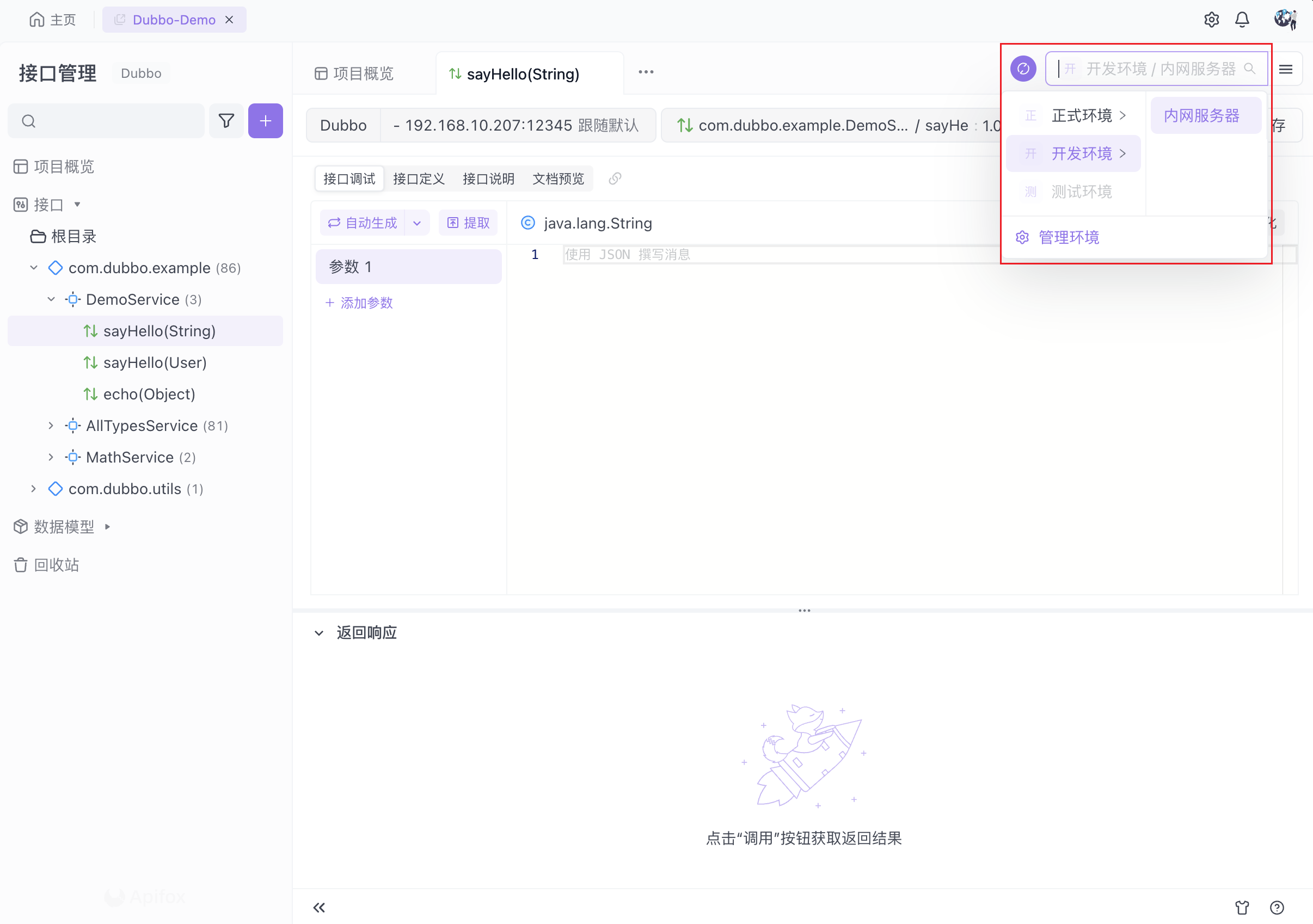 如果需要单独为每个 Dubbo 接口设置不同的服务器地址,可以点击接口地址栏,选择环境并手动切换服务器地址。