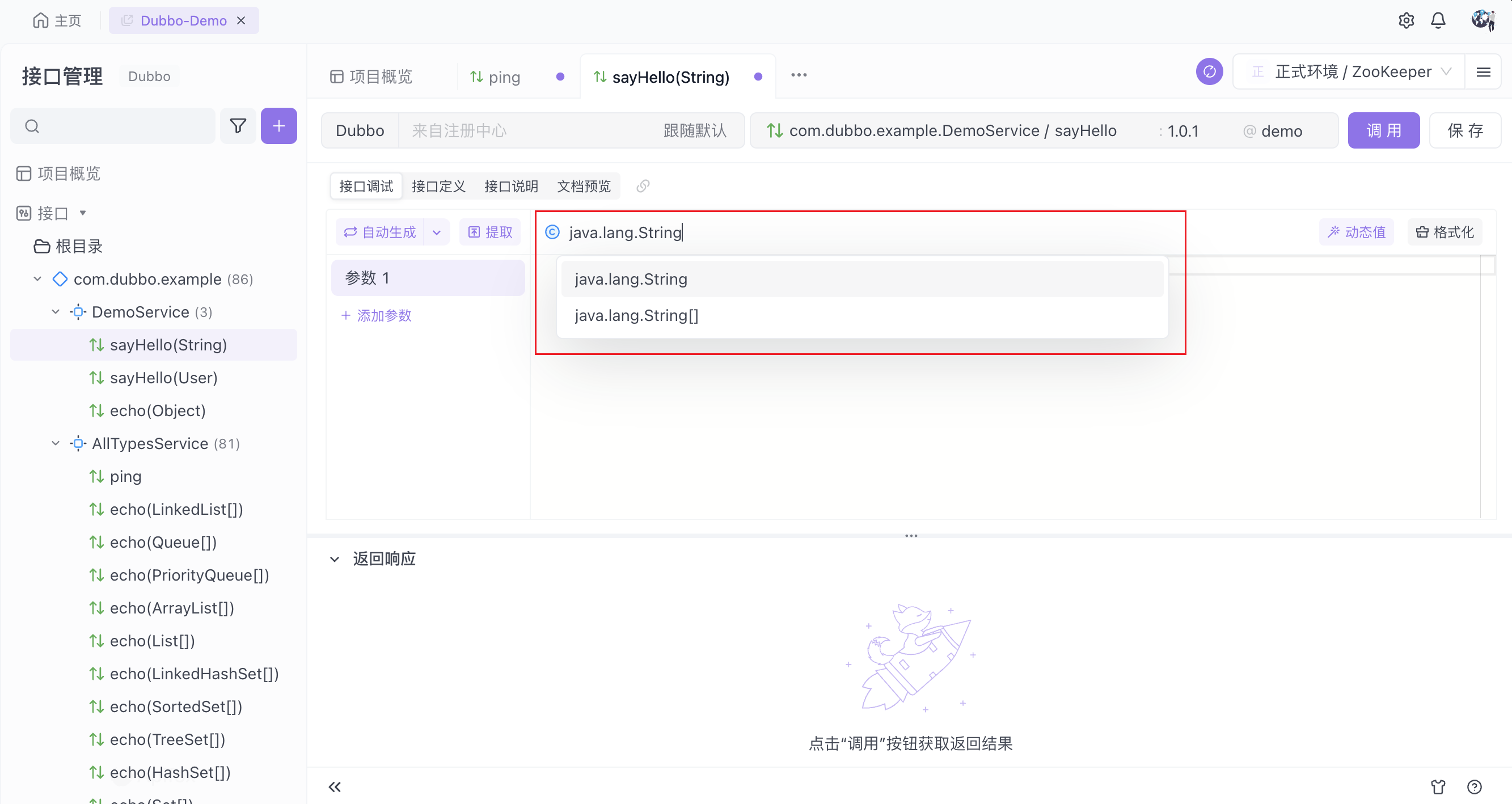 在右上角指定刚刚配置的服务器地址,项目内的其它 Dubbo 接口也将会默认采用该地址。