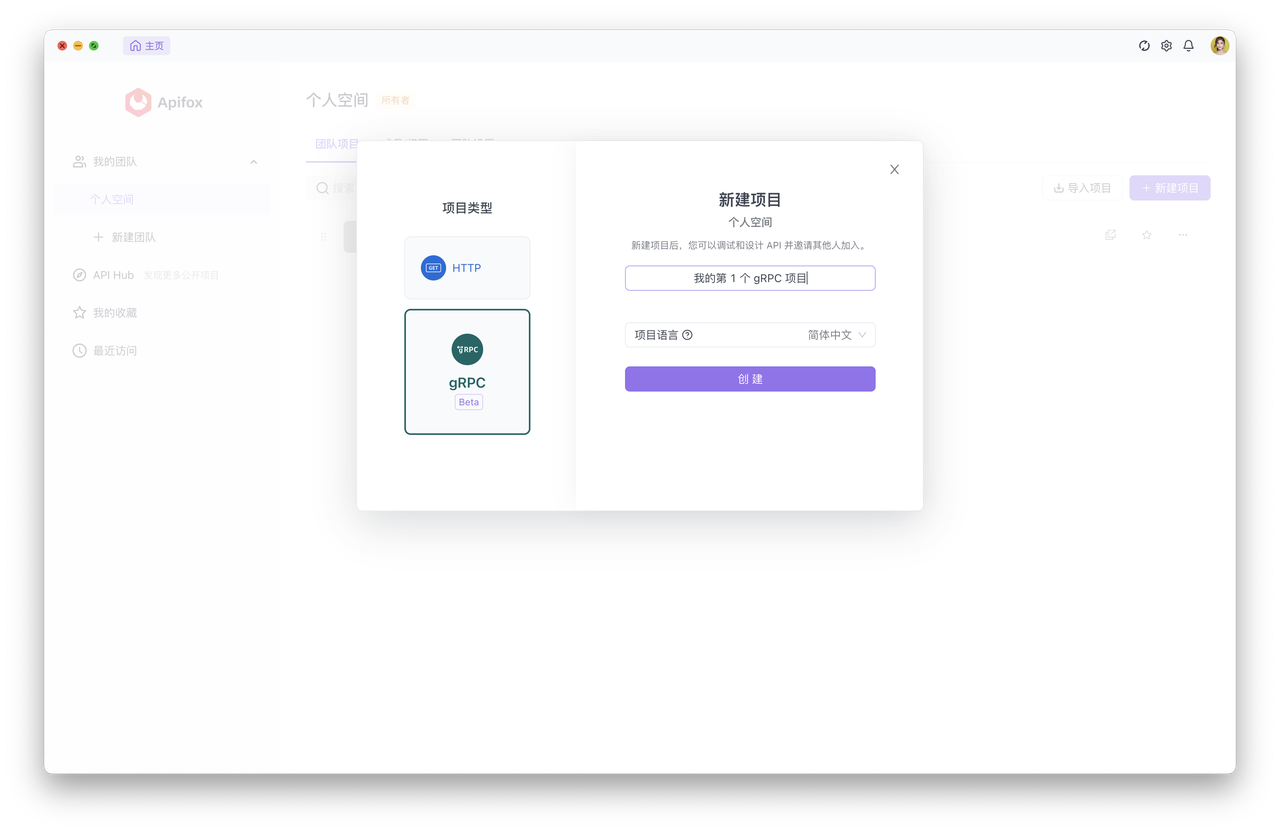 点击 Apifox 首页的“新建项目”按钮,选择 “gRPC 项目(Beta)”。