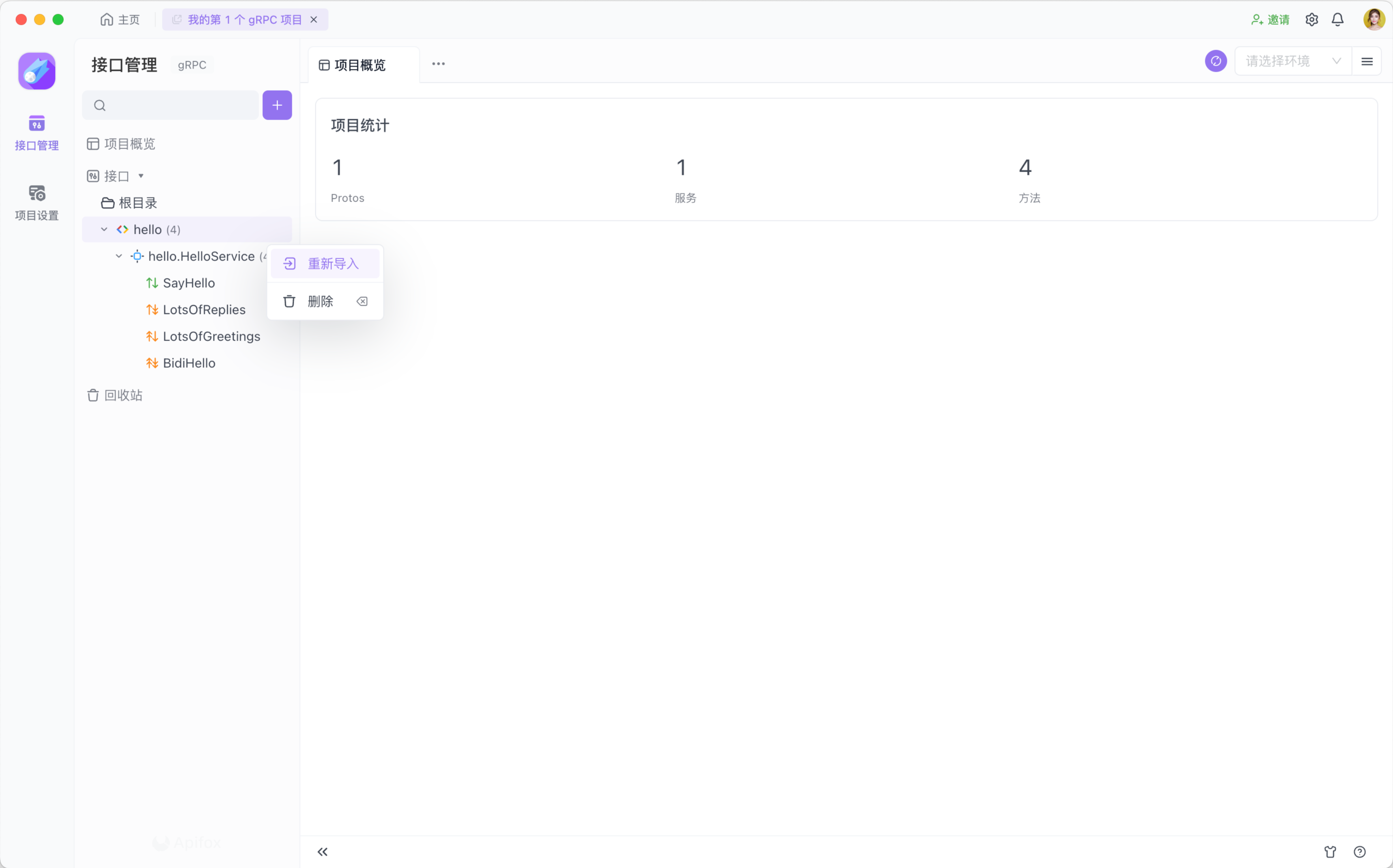 如果导入的 .proto 文件发生了变化,那么可以在 Apifox 内重新导入 .proto 文件:右键点击 Proto,然后点击重新导入按钮。
