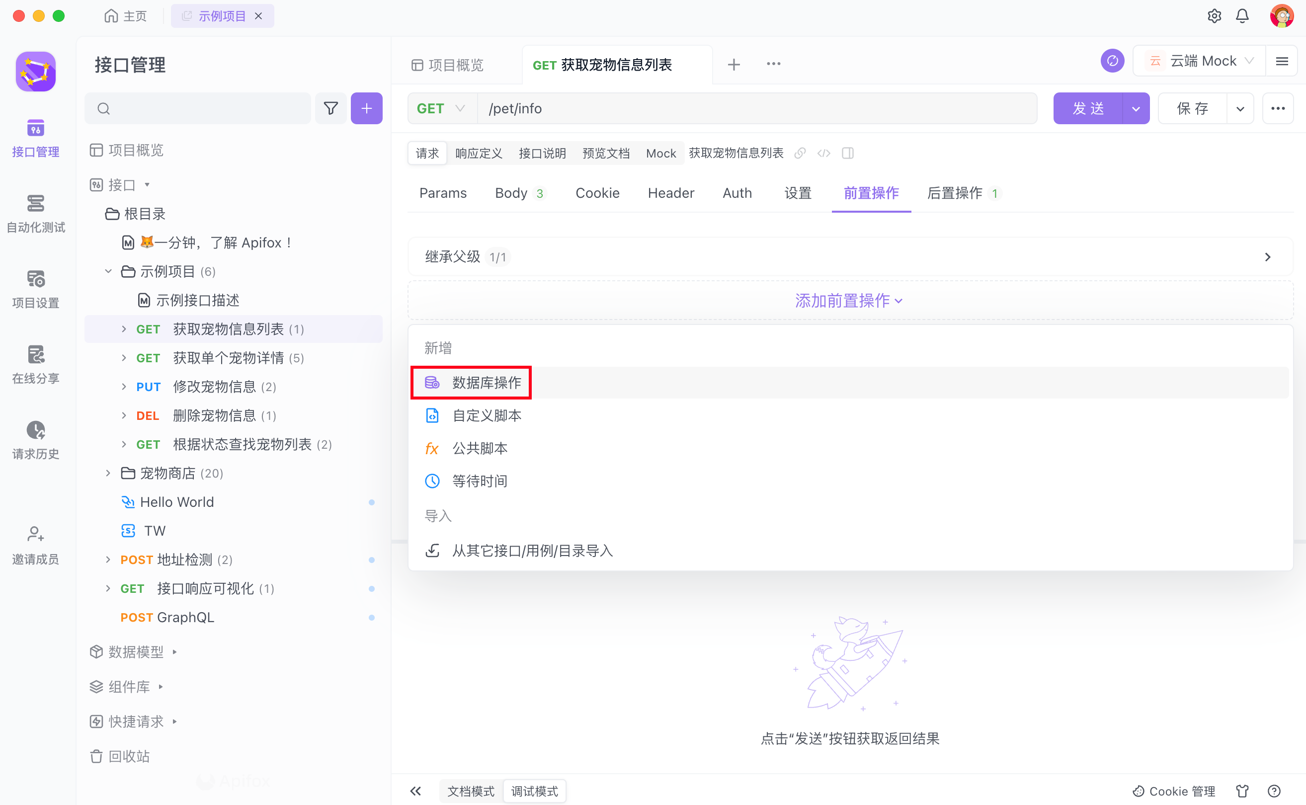 - 点击接口中的“前置/后置操作“,选择“数据库操作”。