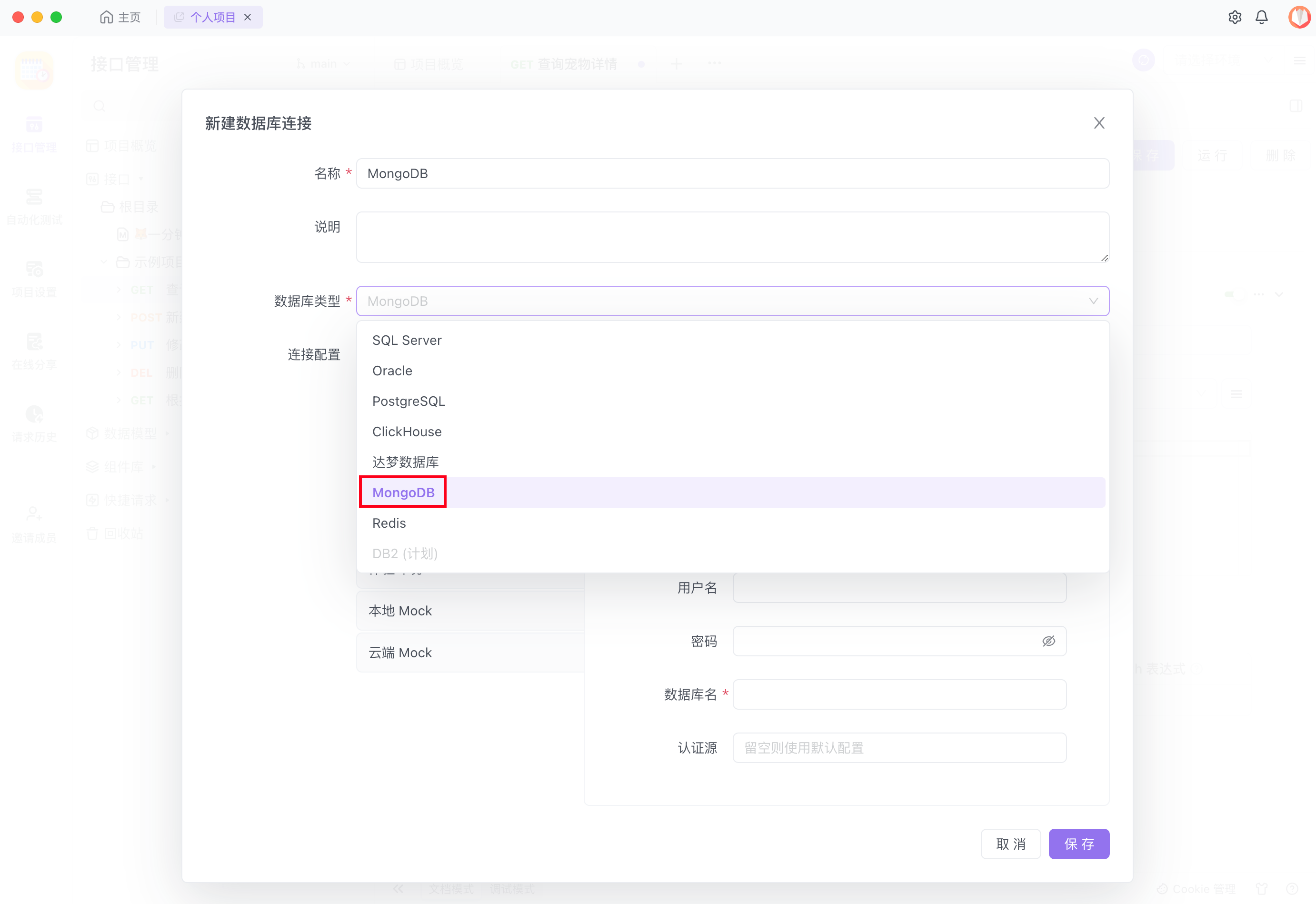 - 选择 MongoDB 数据库类型,然后填写相对应的连接信息。