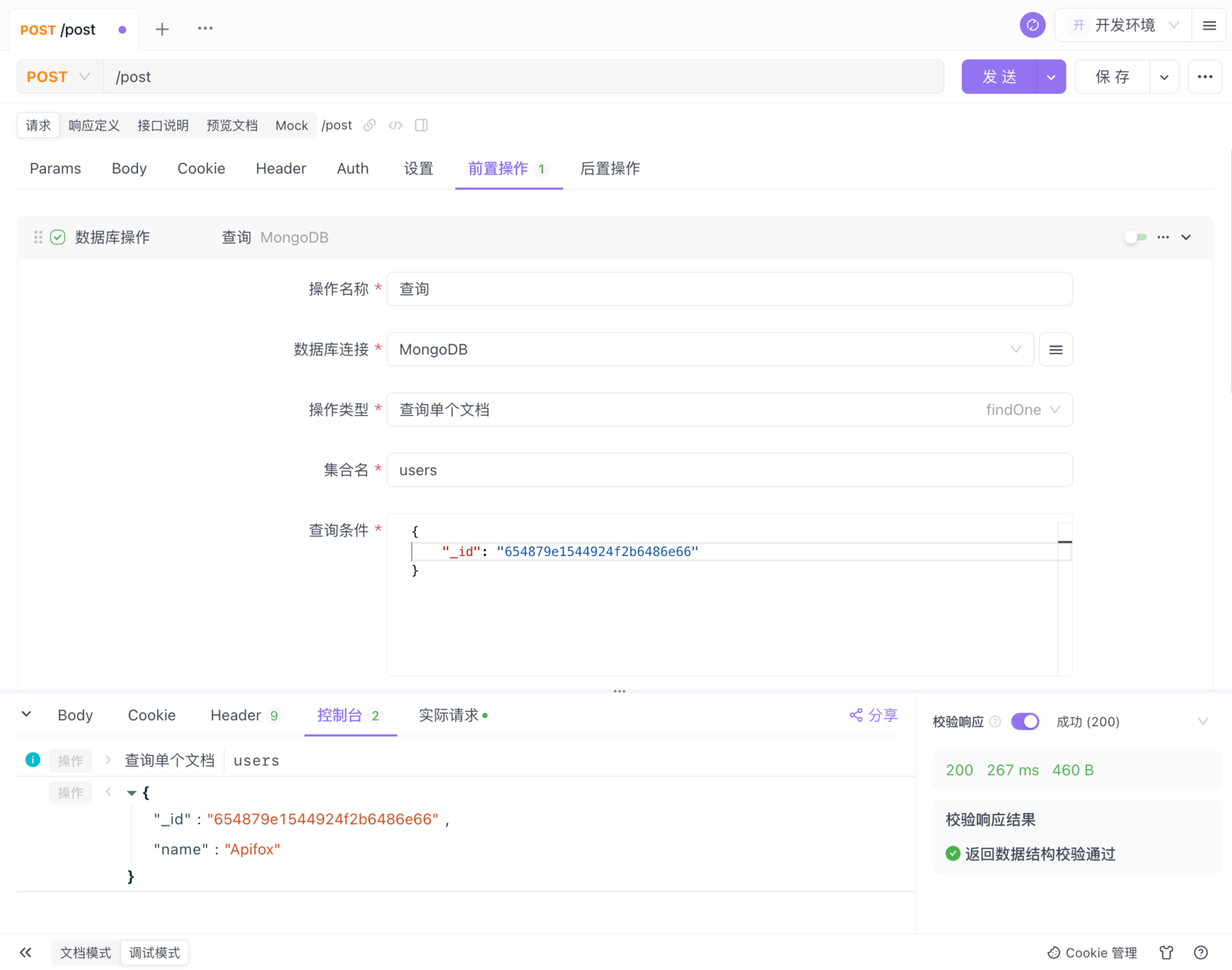 那么使用 Apifox 通过 _id 查询该文档时,在「查询条件」处需要输入的 JSON 值是: