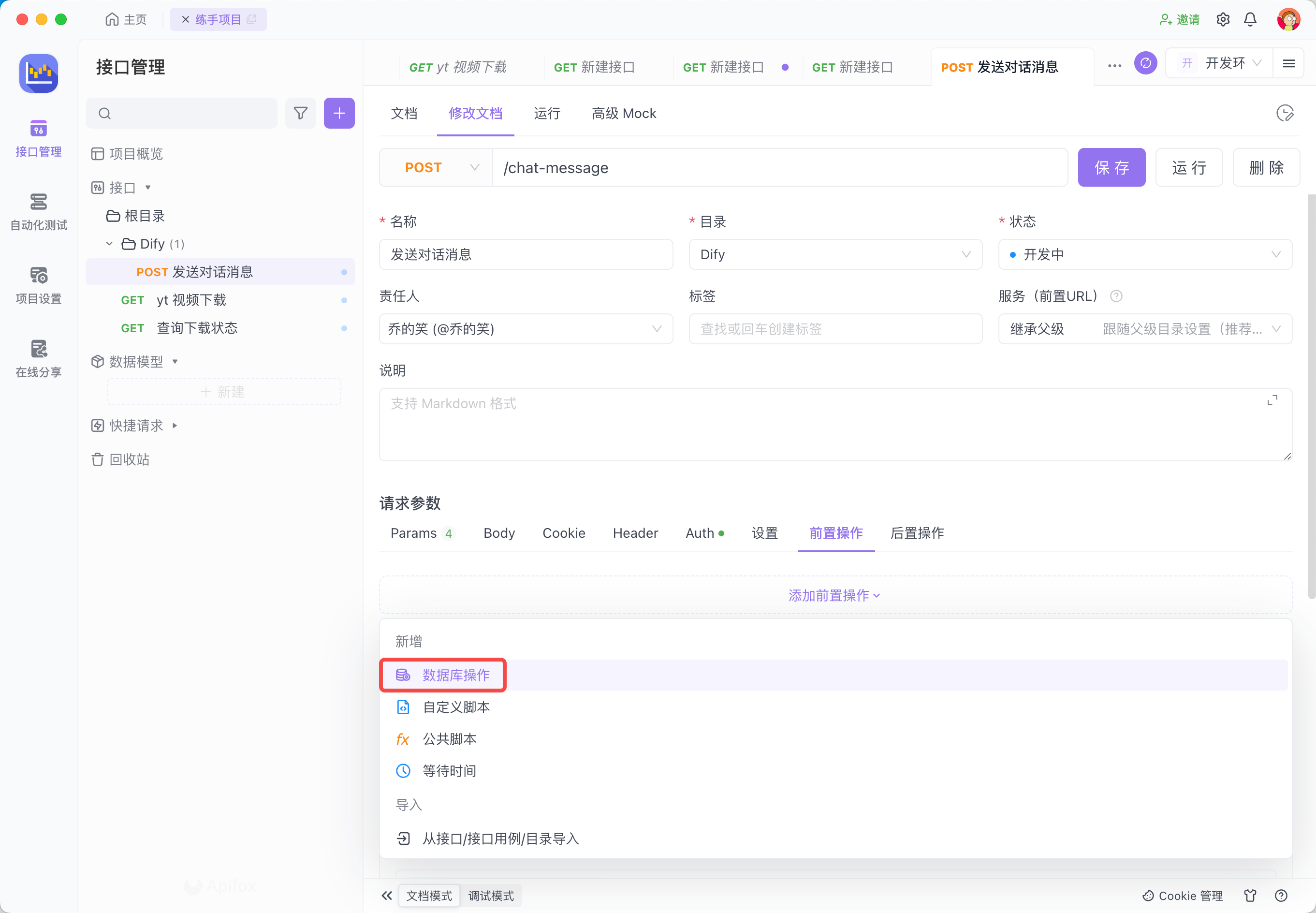 “前置/后置操作”支持添加数据库。查询结果可在接口请求参数、断言、自定义脚本等场景中使用,还支持读写数据库。目前支持 MySQL、SQL Server、Oracle、PostgreSQL 四种数据库类型。