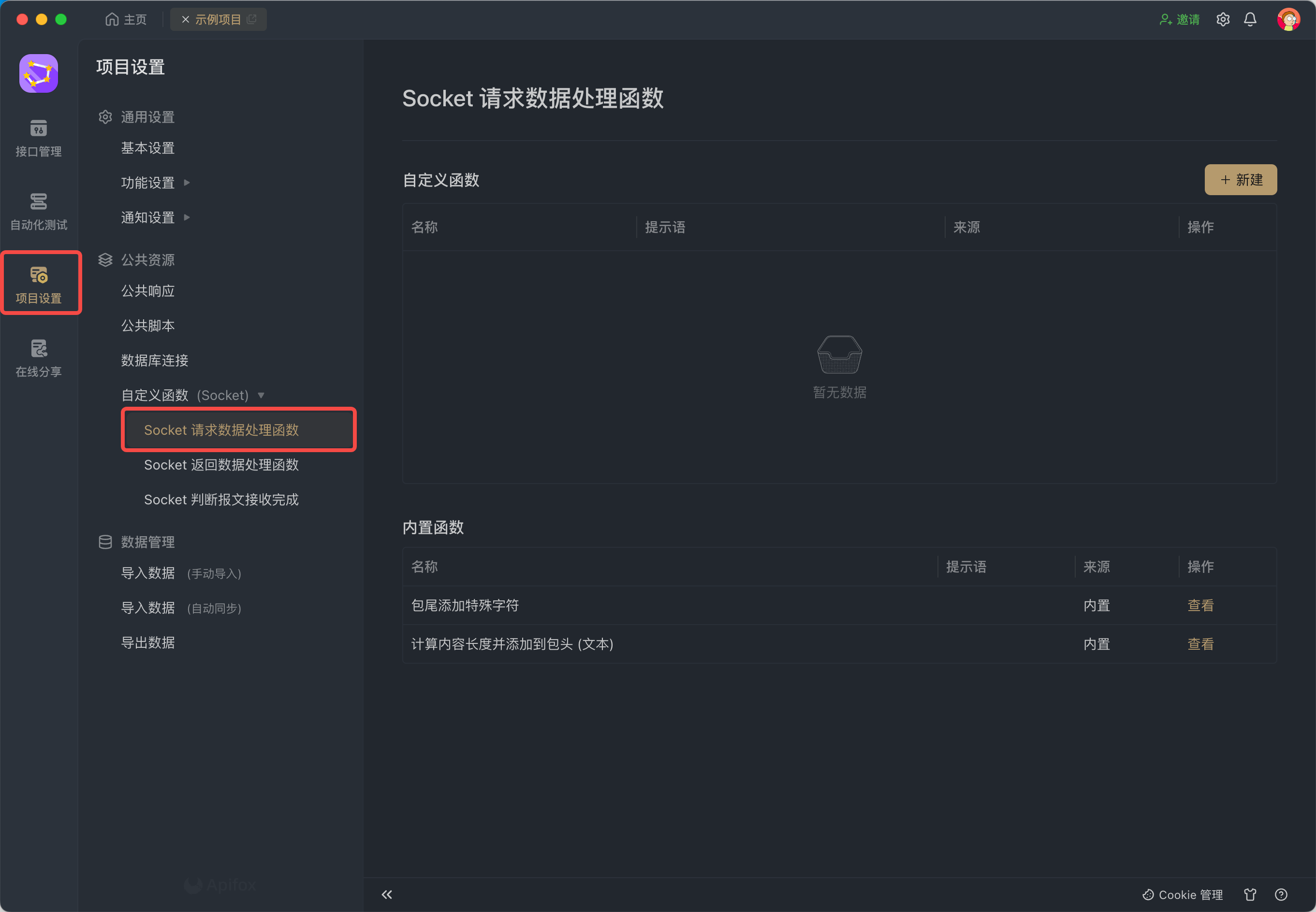 点击“项目设置”->“自定义函数”添加自定义处理器。